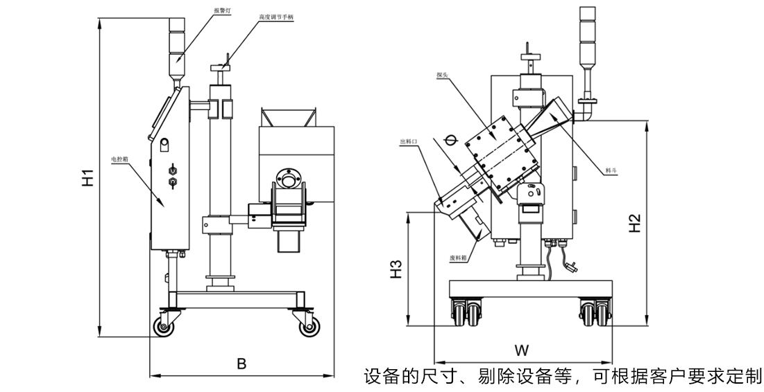 | 9 | 聯(lián)機排除金屬雜質(zhì),保證生產(chǎn)線正常運轉(zhuǎn) 可手動升降機架高度和微調(diào)傾斜角度 易于移動和清洗. |